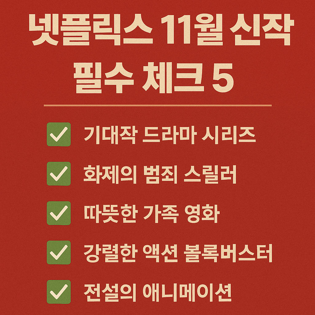 넷플릭스 11월 신작은 대형 오리지널과 국민 취향 저격 로코, 가족 애니, 실화 다큐까지 고르게 포진했습니다. 딱 5가지만 체크하면 완벽 플랜이 완성됩니다: 일정·우선순위·스포 회피·가족 모드·몰아보기 패턴.