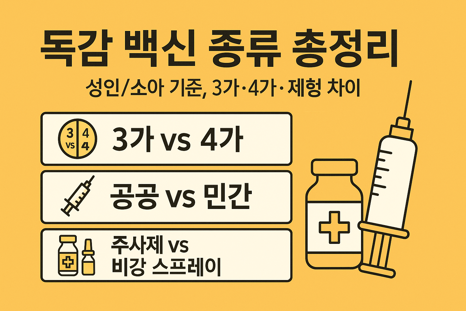 “독감 백신 종류”라는 큰 틀에서 ① 3가 vs 4가, ② 공공(무료) vs 민간, ③ 주사제 vs 비강 스프레이를 한 번에 정리해 보겠습니다.