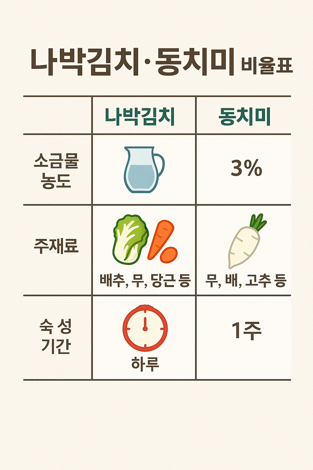 | 동치미(통무) | 5%염수 12~18시간 | 소금 1.2T, 설탕 0.5T, 배 1/2, 마늘·생강·대파 | 서늘 1~2일 → 냉장 5~7일 |