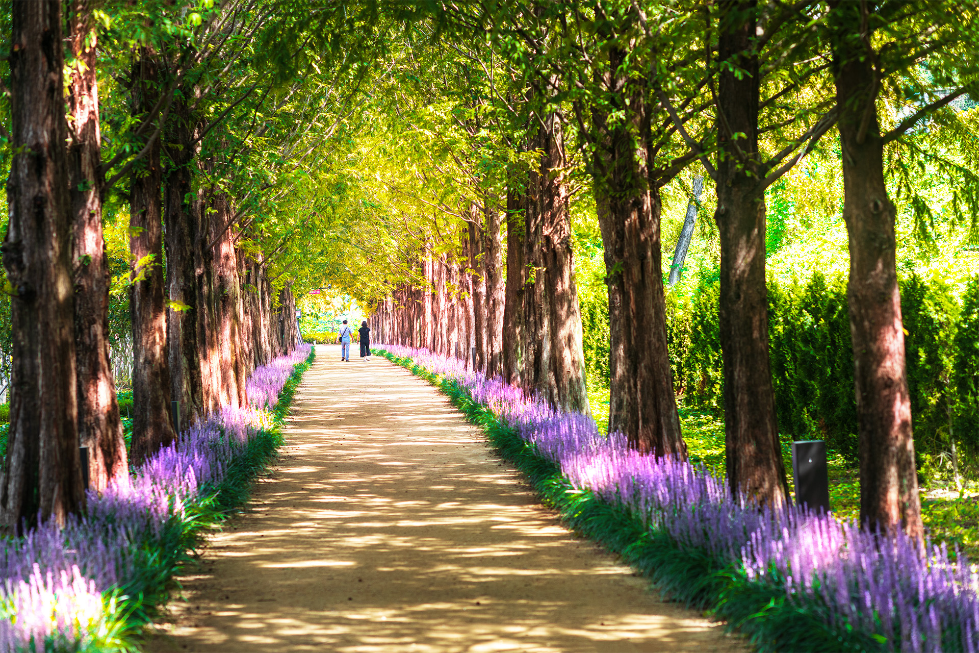 - 메타세쿼이아길 직진 산책 — 보랏빛 맥문동 구간(20~30분)