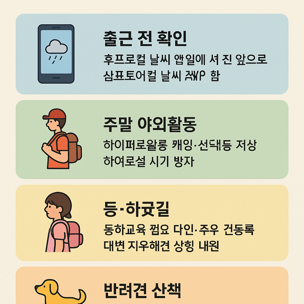 날씨는 단순히 하늘을 보는 것보다 하이퍼로컬 데이터를 기반으로 생활 패턴을 맞추는 것이 훨씬 효율적입니다. 오늘부터는 출근, 아이, 반려동물, 여가 활동까지 동네 단위 예보로 안전하게 대비하세요.