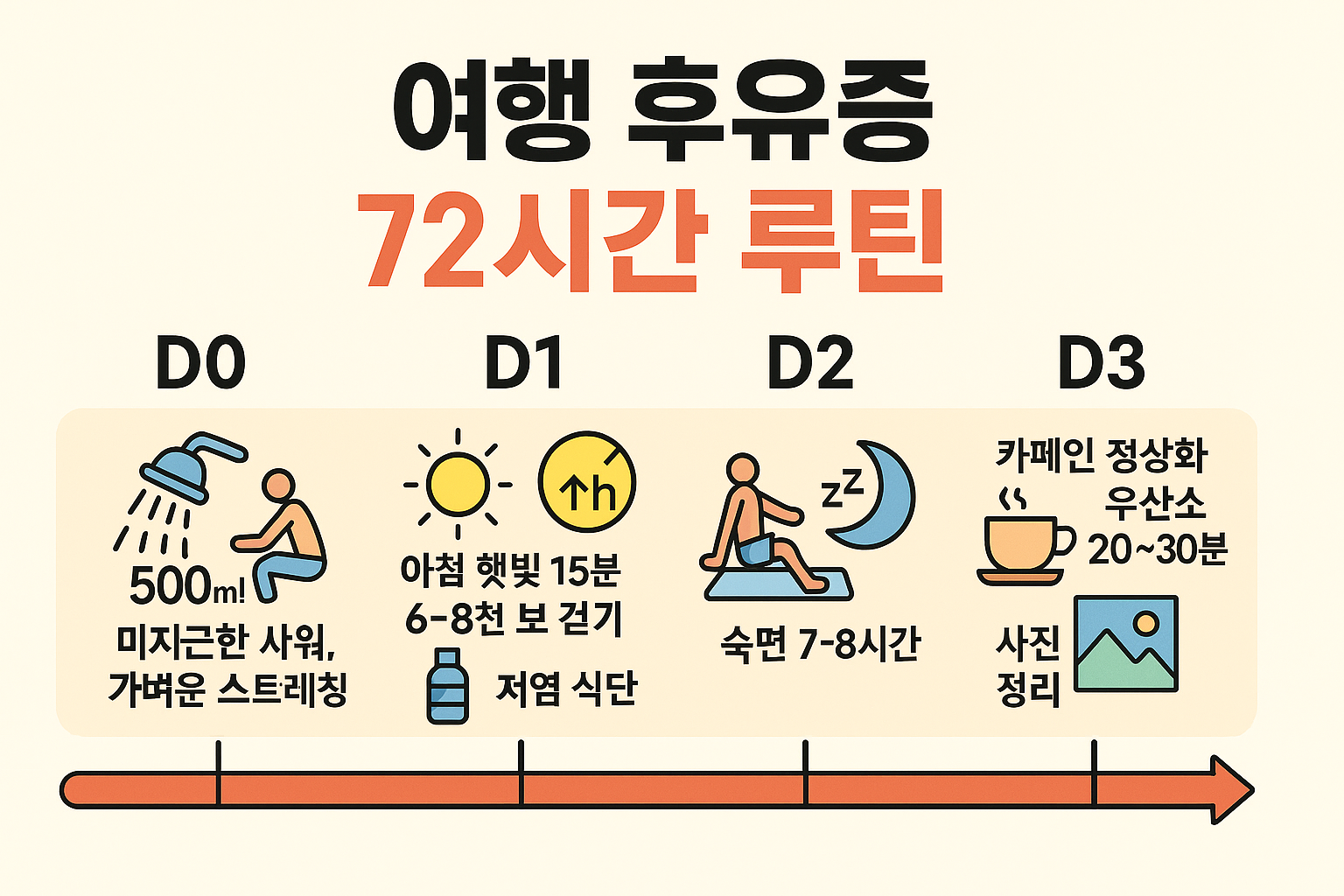 장거리 이동·식사 패턴 붕괴·수면 부족이 겹치면 여행 뒤 두통·허리/어깨 결림·부종·위장 트러블이 몰려옵니다. 돌아온 뒤 첫 72시간만 잘 보내면 회복 속도가 확 달라져요. 아래 시간표+체크리스트로 빠르게 리셋하세요.