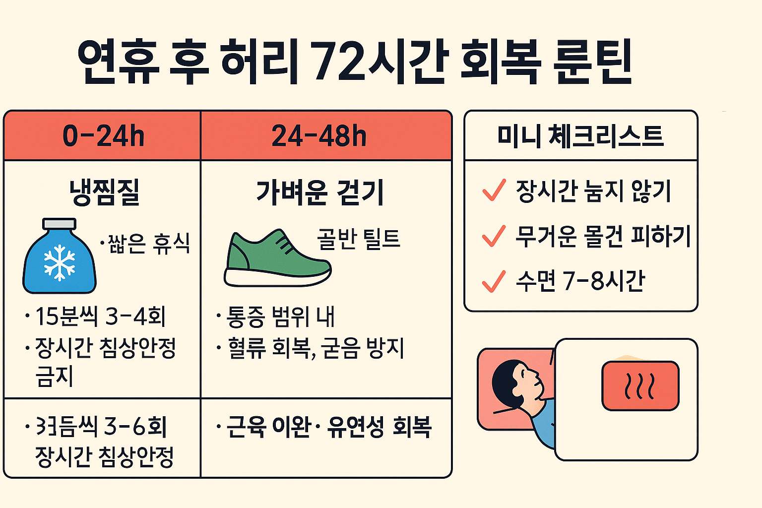 연휴 끝나고 허리 통증? 72시간 회복 루틴(냉·온찜질, 쉬는 법, 가벼운 동작) 한 장 정리
