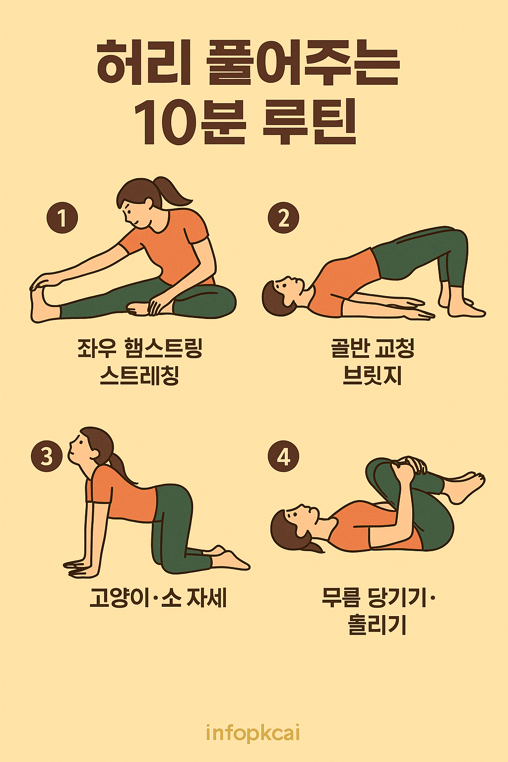 특정 질환(디스크, 척추관 협착, 골다공증 등)이 있으면 운동 선택이 달라집니다. 담당의와 상의하세요.