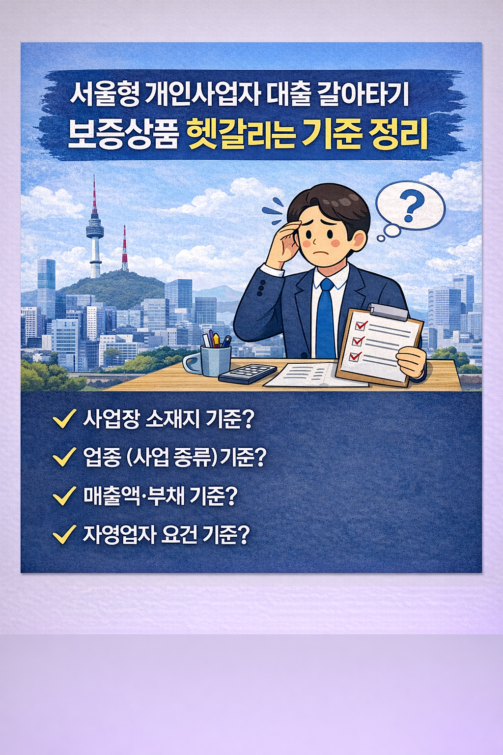 내가 개인사업자/사업자금 대출/서울 사업장 라인에 들어오는지부터 확인하고, 필요한 서류를 한 번에 준비하면 반려를 크게 줄일 수 있습니다.