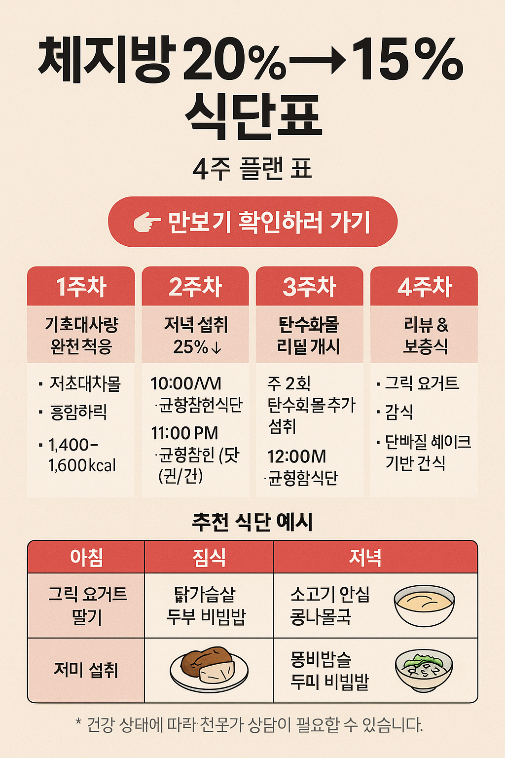 | 주차 | 총열량 | 탄/단/지(%) | 핵심 포인트 |