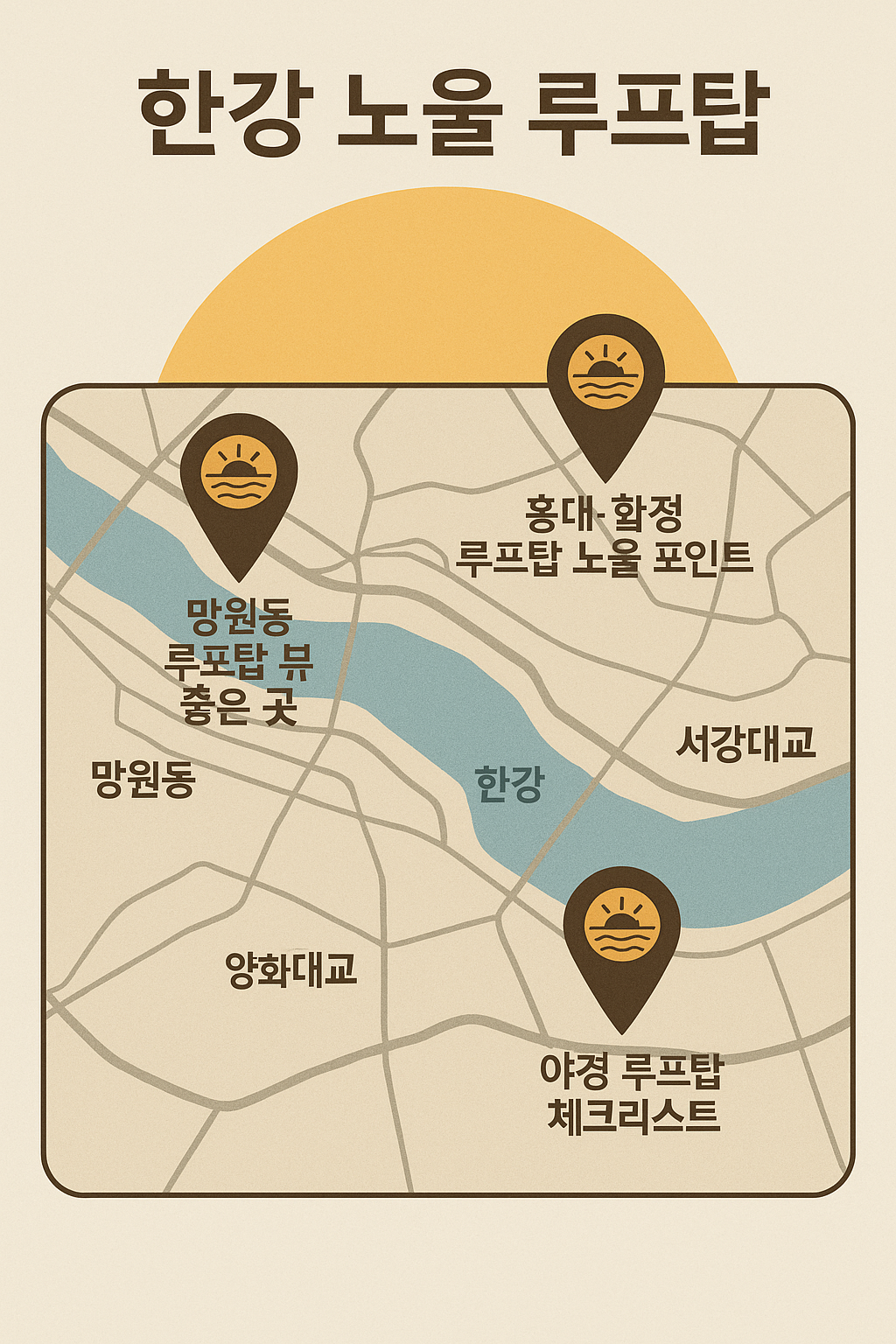 키워드가 두 개뿐이라, 망원 루프탑과 자연스럽게 이어지는 한강 노을 루프탑을 추가했습니다. 노을 방향·바람·좌석만 맞추면 사진 퀄리티가 급상승합니다.
