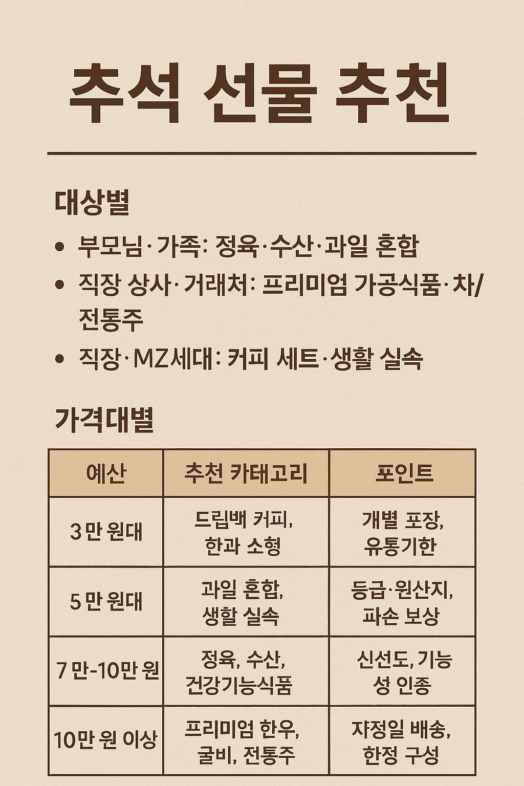 올해 2025 추석 선물은 정육·수산, 건강기능식품, 과일 혼합 세트가 강세입니다. 예산과 대상별로 적합한 품목만 간단히 정리했습니다.