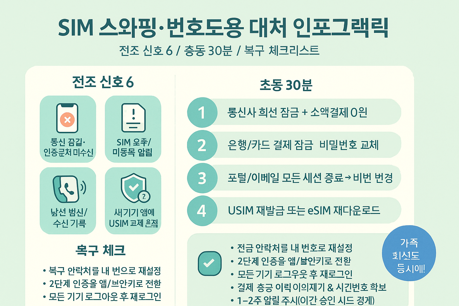 - 복구: USIM 재발급(eSIM 재다운로드) → 2단계 인증 재설정 → 결제·로그인 이력 점검.